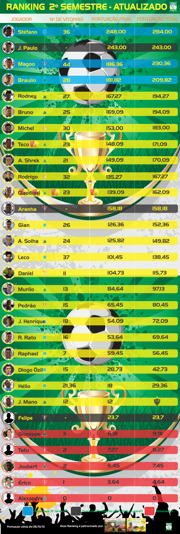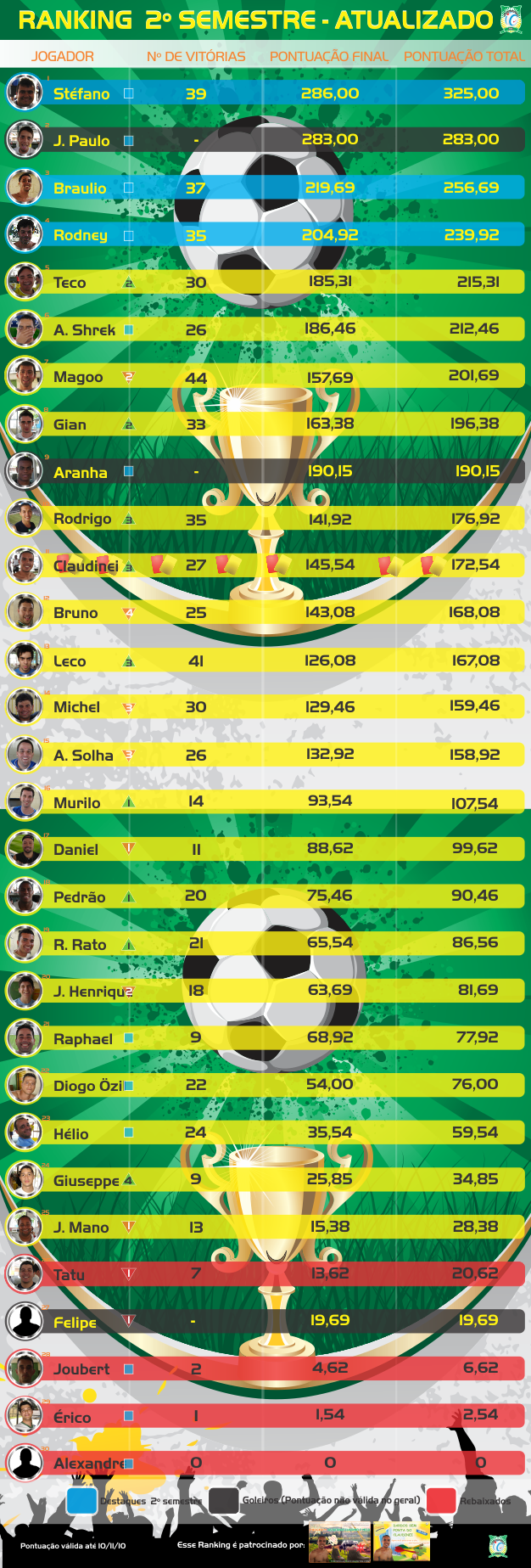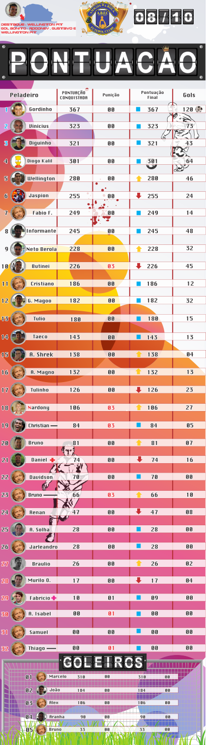 O ranking é bom pois deixa a pelada mais competitiva e os critérios de pontuação permitem que todos possam marcar pontos .....issó é que é democracia no futebol.....agora eu acho que o Braulitos não tem isso tudo de pontos não!!!!!! Ah é, esqueci que ele é o jogador do futuro!!!!Abraços.