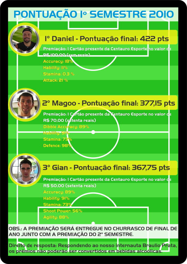 DA PREMIAÇÃO Fica determinado que , os três primeiros colocados no SITE , receberão os seguintes prêmios : No entanto , no que se refere aos "KIT CENTAURO " , está ligado diretamente aos jogadores de linha . Caso algum "Goleiro" venha está presente entre as três primeiras colocações no site , o jogador de linha abaixo na colocação, será o premiado . Os Goleiros , exclusivamente , tem a disputa entre eles , conforme dito no ESTATUTO , sendo destinado ao melhor goleiro com pontuação no site , o direito pelo troféu . Importante ressaltar , que , caso um goleiro , obtenha o maior número de votações á destaque durante o ano , o mesmo , poderá receber o troféu destinado a essa categoria .
